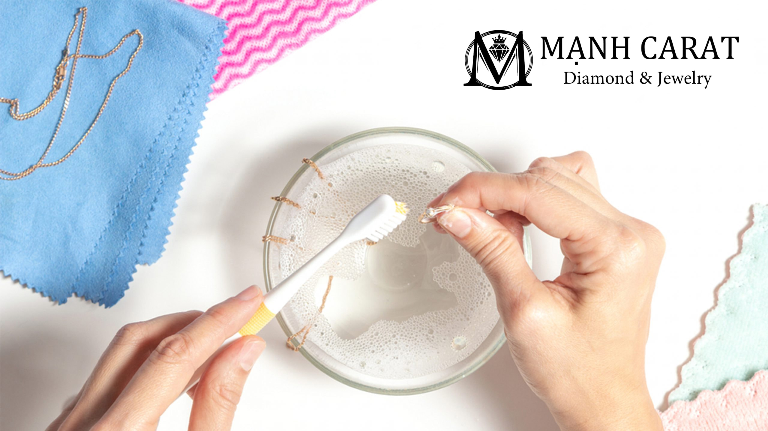 - Nếu trang sức kim cương hơi bẩn: Bạn có thể chỉ cần ngâm, lắc trong nước sạch. Sau đó, xối dưới vòi nước sạch một lúc, rồi lau khô bằng khăn mềm.
